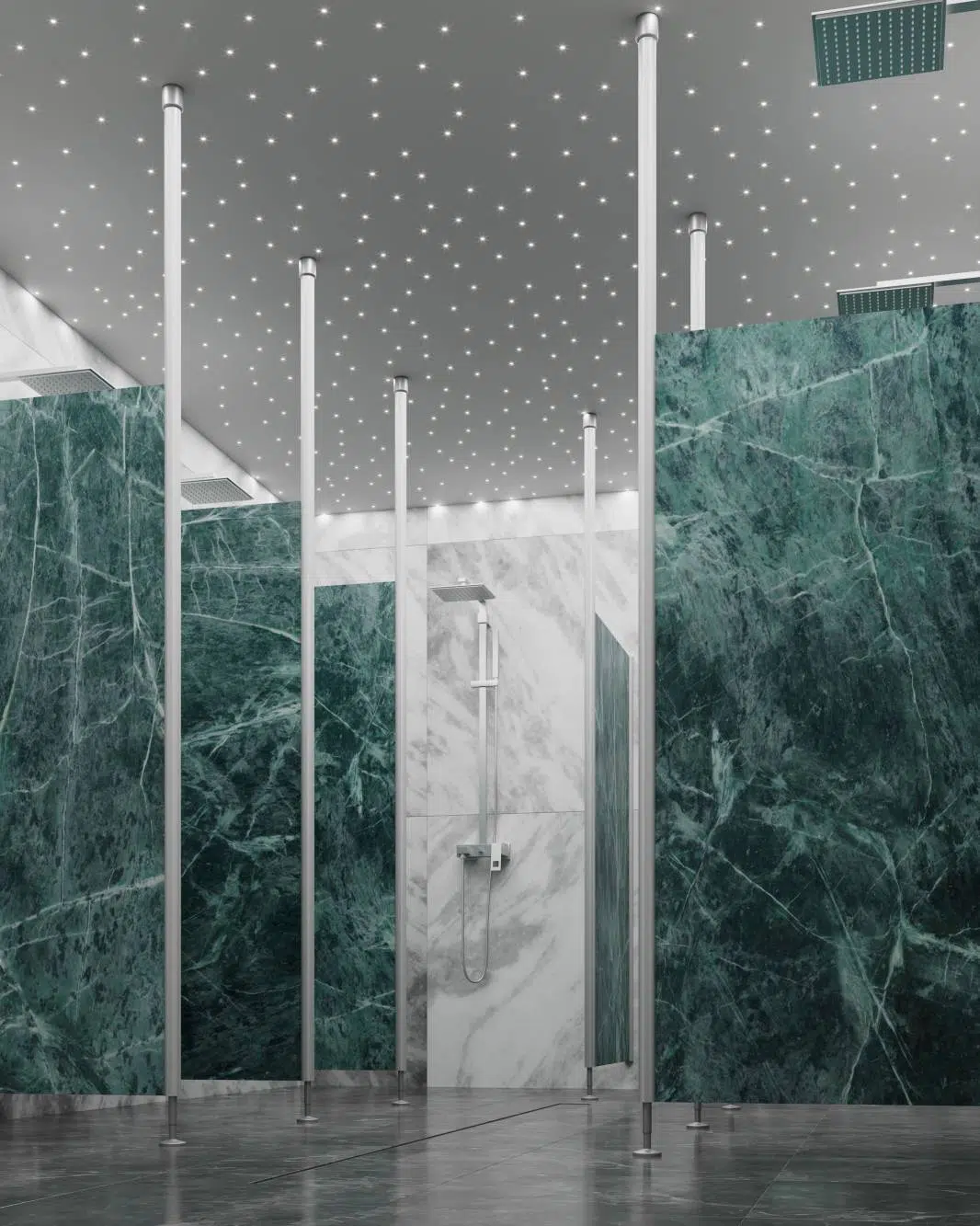 Space Shower Screen with 10 mm compact laminate and naturally anodised aluminium profiles with integrated screws and pre-fitted doors give a nice-looking finish and the most effortless installation on the market. Front profile (Floor-Ceiling) 3000 mm, adapted to fit on site. Standard height 1860mm + adjustable column bases 95-150mm. Standard width 900mm, other dimensions available upon enquiry.