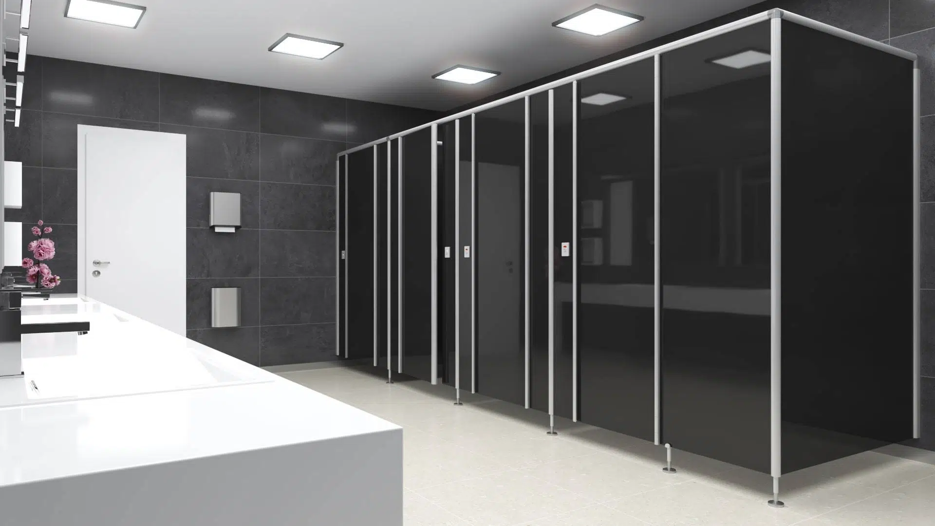 Space Toilet Partitions with 10 mm compact laminate and naturally anodised aluminium profiles with integrated screws and pre-fitted doors give both a nice-looking finish and the easiest installation on the market. The standard height is 2,030 mm, including adjustable column bases measuring 95-150 mm. Our spring hinges with adjustable speed, handles and locks are included as standard. Designed according to customer needs with accompanying drawings.